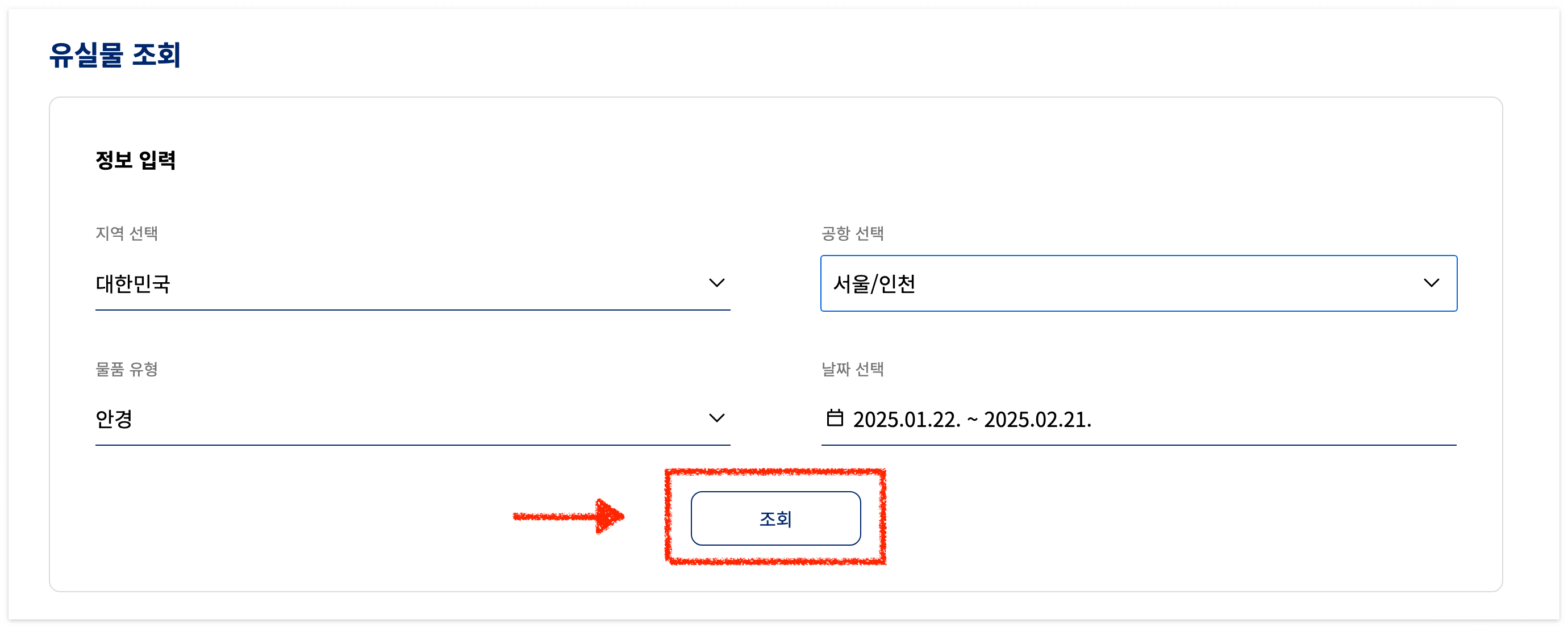 - ‘유실물 조회’ 메뉴에서 지역, 공항, 물품 유형, 날짜를 입력해 주세요.