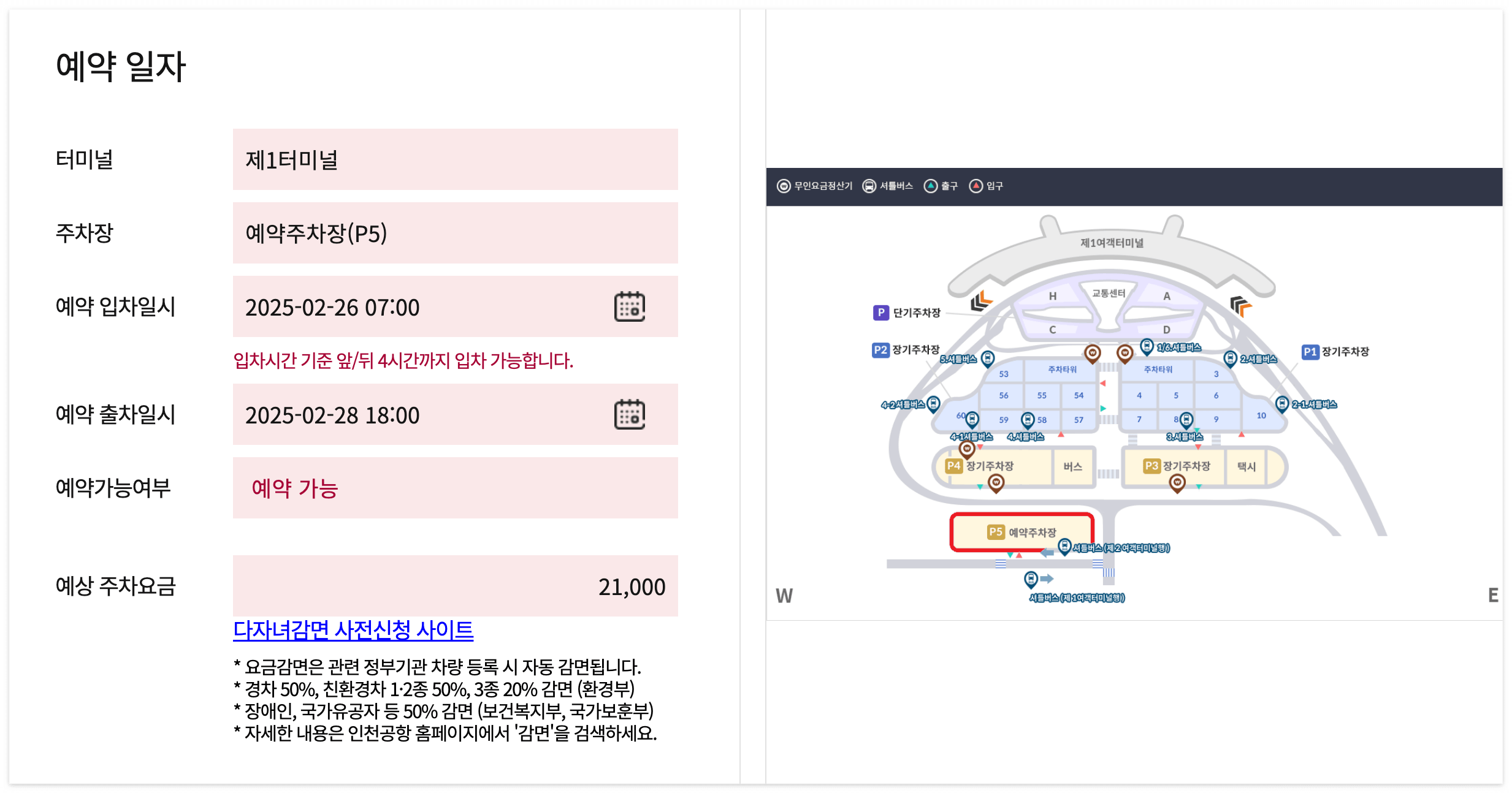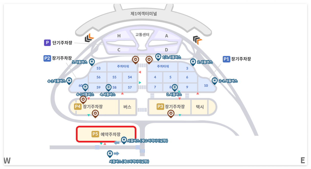 - 예약 시 주차 위치를 꼭 확인하세요. 제1, 2 여객터미널의 예약주차장 위치가 다르므로 헷갈리지 않도록 주의해야 합니다.